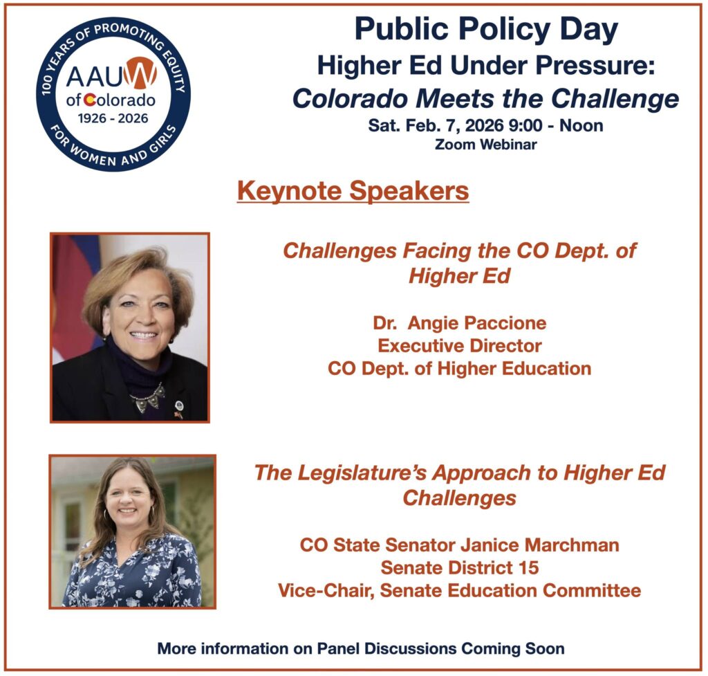 Welcome to AAUW Lakewood! Welcome to AAUW Lakewood! AAUW Lakewood meetings are open to the public and generally held the second Thursday at 7 pm. For specific meeting information, go to Branch Programs page. Register for Public Policy Day HERE